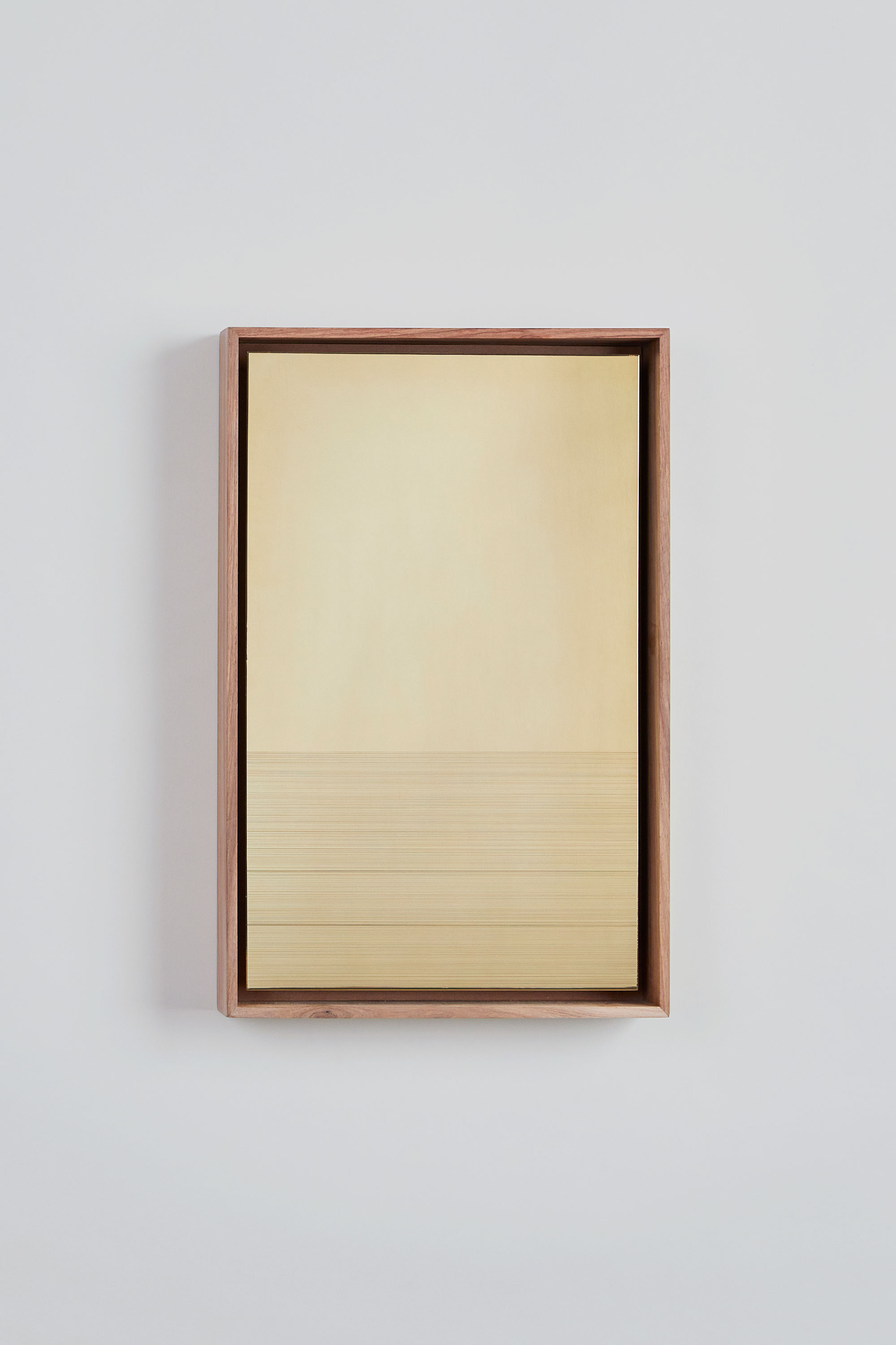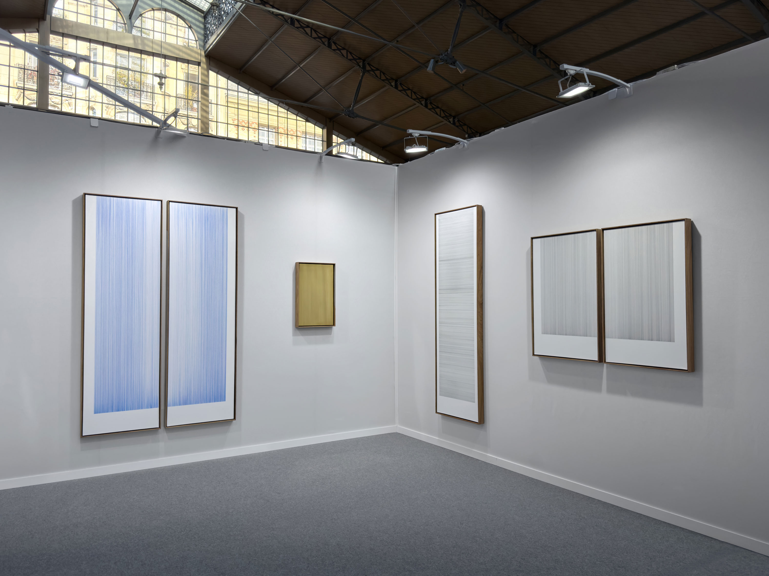 The works in this exhibition are disarmingly understated in their composition: an accumulation of parallel lines on stretched paper, cotton or brass. With only a pencil, needle, and ruler, Visagie meticulously measures and draws line after line across the substrate. Each is witnessed as it is inscribed, the artist attentive to any irregularities: those moments where the sharp lead of the pencil breaks, where the line fades out or is interrupted, where it needs to be reinforced. These areas appear darker, refusing the artist’s ambitions to create a uniform surface. The tone of each line is determined by the weight of the holding hand. With control, the lines are thin and light, but as the hand grows weary, they become heavy, the artist’s fatigue indirectly expressed in the inconstancy of marks.